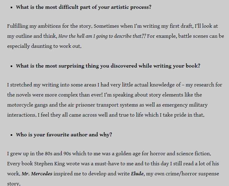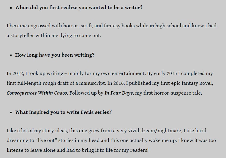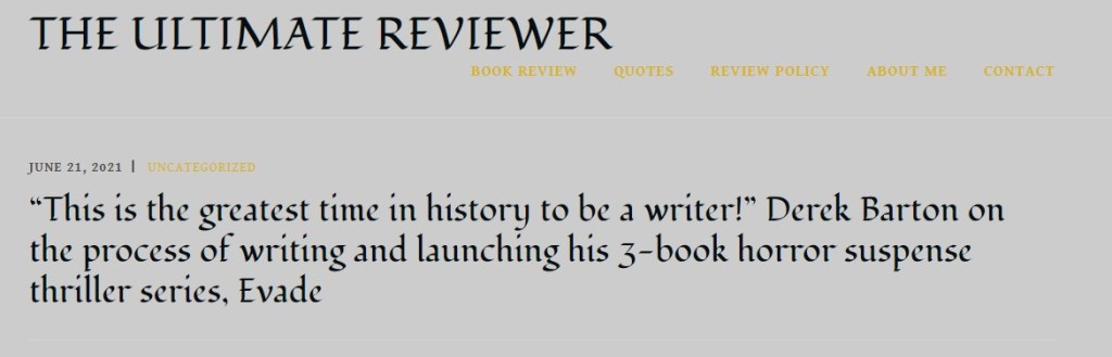 Last week, I had the great honor of being interviewed and having EVADE showcased on the website ULTIMATE REVIEWER.